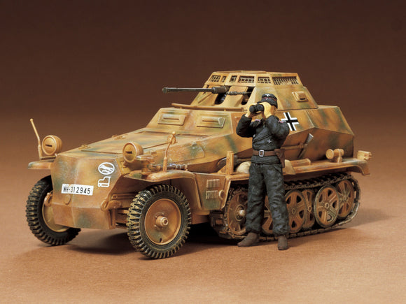 This is a 1/35 scale plastic model assembly kit recreating the German WWII half-track Sd.Kfz. 250/9. ★From the open-top turret to the 20mm cannon, the form of the compact vehicle is captured faithfully. ★Link-type assembly tracks lend a further air of realism to the depiction of the complex suspension. ★Comes with a figure peering through binoculars.