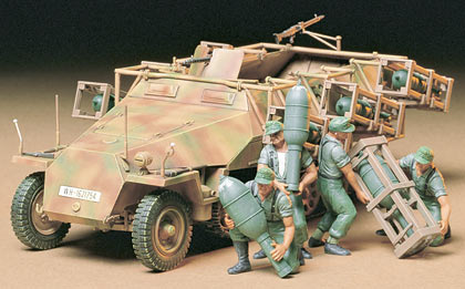 This plastic model assembly kit recreates the German rocket launcher that was so effective the German Army soldiers who used it dubbed it the "Stuka zu Fuss" (Stuka on foot); comparing it to the feared aircraft used by their Luftwaffe counterparts. The model captures its boxy frame capable of firing 6 rockets from the launchers mounted left and right, plus the complex suspension and interior visible from the open top. 4 realistic figures depict crew in the act of loading.