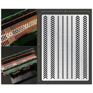 This Fallout Hobbies Chevrons Vinyl Airbrush Stencil contains one (1) 5in x 7in low tack black vinyl Chevrons Airbrush Stencil sheet.