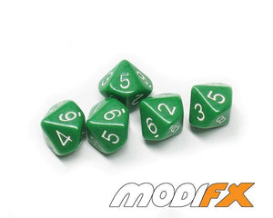 This Modifx Opaque 16mm D10 Green w/White Dice set contains five (5) 16mm D10 Green dice with White Pips.