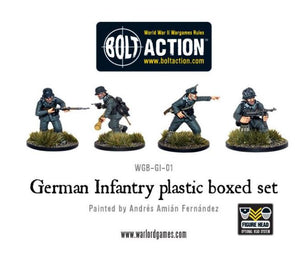 - 5x German Infantry Sprues (5 soldats per sprue). Enough plastic components to make 25 German infantry miniatures. Includes a host of options to allow for different weapon configurations and command models.