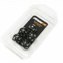 This Modifx Opaque 20mm D20 Black w/White Dice set contains five (5) 20mm D20 Black dice with White Pips.