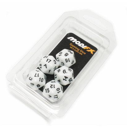This Modifx Opaque 20mm D20 White w/Black Dice set contains five (5) 20mm D20 White dice with Black Pips.