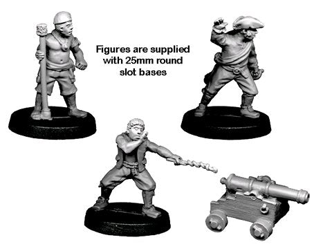 Pirate Cannon and Crew. 3 Crew and 1 cannon. 28mm figures, supplied unpainted. Figures need plastic bases that are included.