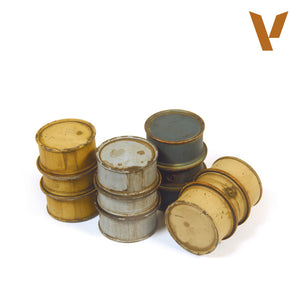 Four fuel drums with side cap, in military use during WWII for fuel storage and transportation.