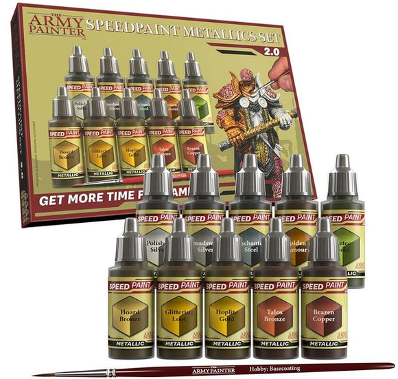 Our revolutionary new Speedpaints Metallics are the easiest way to get metallic effects on your miniatures in one simple application. Speedpaint Metallics are the hobby's first-ever metallic one-coat painting solution, and this paint set is the fastest way to get your hands on all ten! With colours ranging from rich Talos Bronze, to shimmering Broadsword Silver, and glimmering Hoplite Gold – you have the perfect metallic selection for your hordes of plate mail, carapace, and armour.