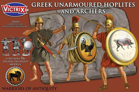 This exceptional 56 figure set of 28mm hard plastic Greek Unarmoured Hoplites and Archers has superbly detailed figures and a myriad of additional parts allowing hundreds of options when building the figures.